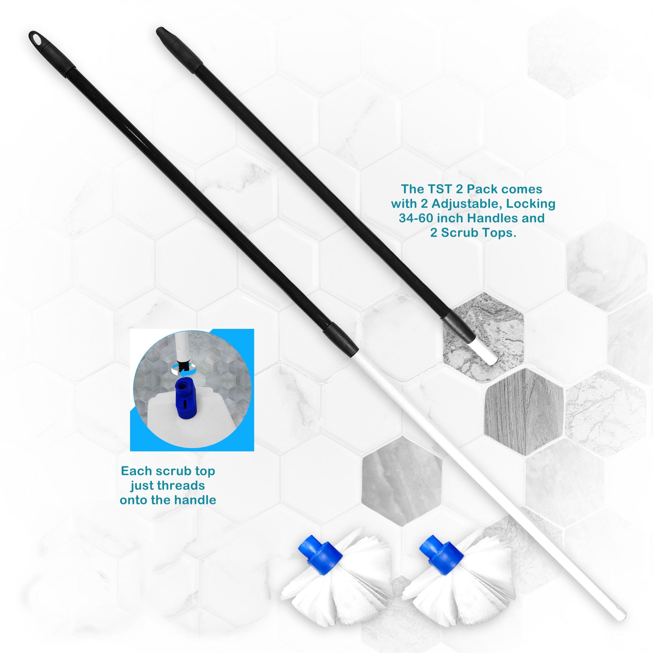 Is bathroom cleaning a dreaded chore that leaves your back and knees aching? The Tub Scrub 2 brush pack is the easier, faster solution for tackling tub and tile grime. No more bending and kneeling to scrub every inch thanks to the adjustable length handles that allow you to clean from top to bottom. The extra large scrub pads blast through soap scum faster than regular scrub brushes, so you can cut your cleanup time in half.